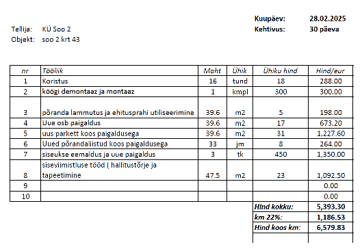 ERLEX OÜ hinnapakkumise alusel on korteri 43 koristamise maksumuseks pakutud 288 eurot. Kui üldkoosolek otsustab koristamise maksumuse heaks kiita ja Seaduse järgi tegutseb, siis 288 eurot on summa, mida peavad oma kohustust rikkunud (viis korterit) maksma. Kui lähtuda seadusest ja pakkumisest, siis ilmneb, et ka kompromiss (6940 €) on kordades üle paisutatud.